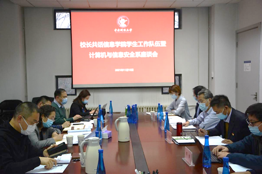 为进一步深化党史学习教育,推进“我为师生办实事”实践活动深度发展,深入一线、联系师生、问计基层,把准一线脉搏,把握教育规律,将“一线规则”落到实处。11月16日下午,yl6809永利召开“校长共话yl6809永利学生工作队伍暨计算机与信息安全系座谈会”。校长王瑶琪、校长助理兼yl6809永利院长李涛、yl6809永利党委书记章宁、学院党委副书记方德风、副院长王秀利、副院长李海峰、学院辅导员老师和计算机与信息安全系教师代表面对面交流,倾听一线声音,共话校院发展。