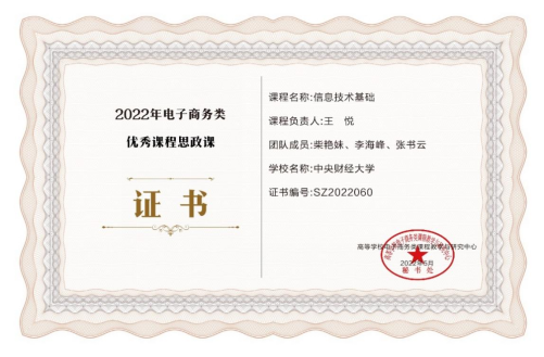近日,我院信息管理与电子商务系教师王悦主讲的课程《信息技术基础》获评高等学校电子商务类课程教学与研究中心评选的“2022年电子商务类优秀课程思政课”,其制作的课件获评2022年“北京高校优质本科教材课件”。