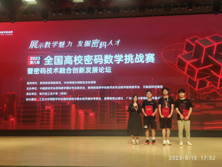 本届赛事由教育部、中央网信办指导,中国密码学会密码数学理论专业委员会、教育部高等学校数学类专业教学指导委员会、天融信科技集团联合主办,哈尔滨工业大学(深圳)承办。竞赛以“展示数学魅力,发掘密码人才”为宗旨,面向各高等学校具有正式学籍的全日制在校本科生、硕士生与博士生展开,今年共收到来自全国100余所高校、220余支队伍、600余名选手报名参赛,经竞赛专家委员会权威审议,共评选出42支队伍晋级全国线下总决赛。我院三名本科生组成的队伍进入决赛,与来自南开大学、中国科学院大学、上海交通大学、北京邮电大学等院校的全国优秀学子同台竞技。最终,经过分组答辩、现场公开提问、专家集中审议等环节,我院学子所提交作品被评为三等奖。