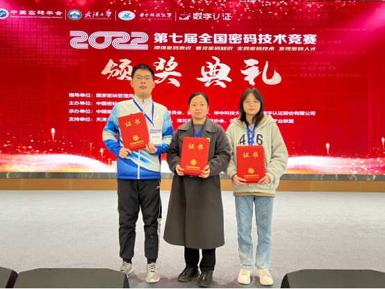 2023年3月16-18日,第七届全国密码技术竞赛决赛在武汉大学国家网络安全学院举行。我院2020级信息安全专业彭睿、石鑫、吴林晨三位同学组成的参赛团队,在领队老师兼指导老师段美姣的带领下参加了比赛,历经初赛、复赛和决赛的激烈角逐,最终参赛作品《基于策略的动态变色龙认证树设计与实现》荣获三等奖。
