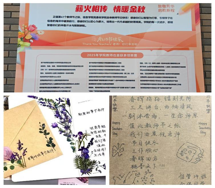 节日期间,学院楼放置庆祝教师节的醒目标语,信彩飞扬公众号和学院网站推送优秀教师风采。学生代表在节日当天为在校教师送鲜花,同学们也纷纷亲手书写祝福卡片和集体录制视频表达对恩师的诚挚祝愿,让每一位教师都感受到了浓浓的节日温情和职业幸福感。