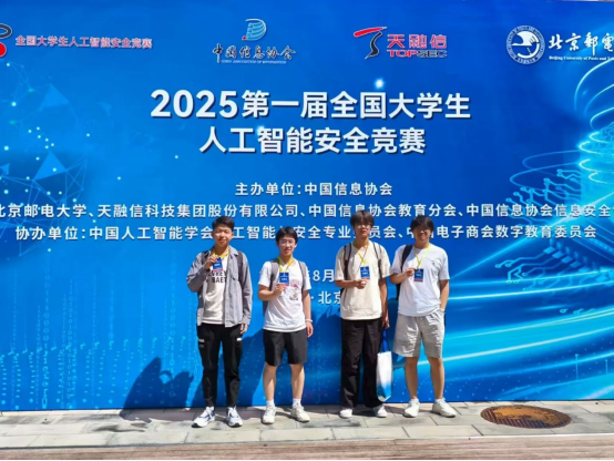 2025年8月25日,由中国信息协会主办,北京邮电大学、天融信科技集团、中国信息协会教育分会及信息安全专业委员会联合承办的第一届全国大学生人工智能安全竞赛决赛,在北京邮电大学沙河校区顺利举办。我院2023级信息安全专业赵启成、宋华秋、龙泽兴,数据科学与大数据技术专业滕凯四位本科生组成的“王者小纵队”团队,在网络空间安全系段美姣老师的指导下,参加了人工智能安全攻防对抗赛,经过激烈的角逐,最终获得全国三等奖。